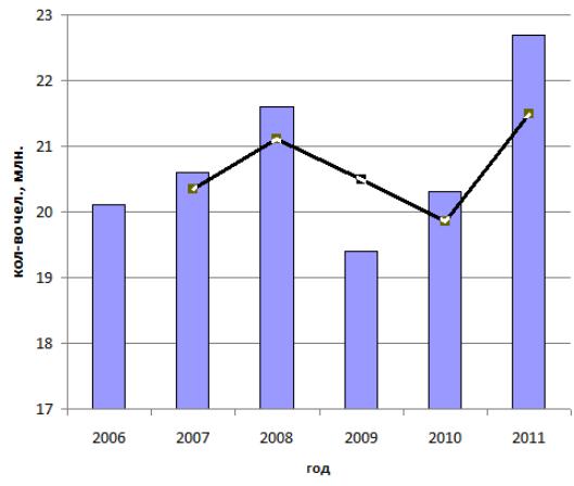 Многочисленные исследования о потенциальных возможностях российской туристской индустрии позволяет сделать вывод о том, что имеющийся значительный туристский потенциал страны используется далеко не в полной мере. Для прогнозирования возможных вариантов развития индустрии туризма и гостеприимства в РФ проведен анализ текущего состояния туристского рынка. В 2011 году Российскую Федерацию посетили 20,6 млн. иностранных граждан, из которых около 18 процентов прибыли с туристскими целями, тогда как, согласно прогнозу Всемирной туристской организации, являющейся специализированным учреждением Организации Объединенных Наций, Российская Федерация при соответствующем уровне развития туристской инфраструктуры способна принимать в год до 40 млн. иностранных туристов. На рис. 2.1 представлена гистограмма соотношения количества иностранных туристов от года, и по виду полученной зависимости видно, что необходимо использовать линию тренда