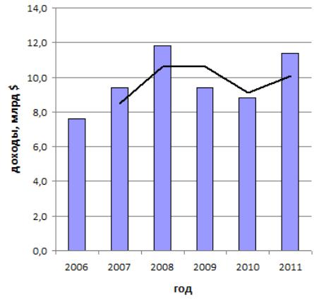 Расходы иностранных туристов в России за восемь месяцев 2012 года выросли на 16 %, следует из доклада Всемирной туристской организации. Таким образом, Россия оказалась на восьмом месте по росту доходов от туризма в мире. Больше всего доходы от туризма выросли в Японии (на 48 %), Швеции (на 26 %), Южной Африке (на 26%), Республике Корея (на 26 %), Индии (на 23 %), Гонконге (на 17 %), Таиланде (на 17 %) и в России (+16 %). Всего же за 2011 г. доходы России от туризма составили 11,4 млрд долл., что при имеющемся потенциале страны, не может рассматриваться как положительный показатель. Анализ линии тренда с линейной фильтрацией позволяет сделать вывод о том, что динамика доходов, полученных Россией от индустрии туризма, весьма не стабильна и характеризуется неустойчивыми колебаниями (рис. 2.2).