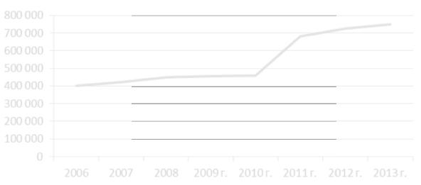 Ежегодно область посещают, по разным оценкам, от 100 до 150 тысяч неорганизованных туристов на автомобилях, которые р азмещаются по местам водоемов и никак не могут быть учтены в официальной статистике. Внутренний поток ту ристов в Волгоград и Волгоград скую область, по данным государственного казенного учреждения «Аген тство развития туризма», за последние 8 лет увеличился в среднем на 5 % и составил в 2013 году приблизите льно 748 тыс. человек (рис. 2.5).