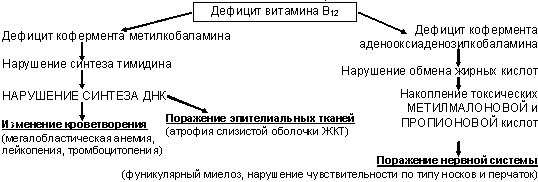 Недостаточность фолиевой кислоты обусловливает нарушение синтеза тимидин- монофосфата и включения в молекулу ДНК уридина и оротовой кислоты. Это сопровождается переходом нормобластического типа кроветворения на мегалобласти- ческий.
