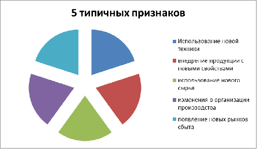Исследования по теории инноваций и инновационной деятельности проводятся с конца 20-х годов прошлого столетия. Сущность инновационных процессов раскрыта в работе австрийского экономиста Й. Шумпетера «Теория экономического развития». Понятие «инновация» рассматривается им как нововведение, то есть новая научно-организационная комбинация производственных факторов с выделением пяти типичных признаков (рисунок 1):
