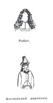 Постепенно брыжи перестают носить, их сменяет в двадцатых годах XVII века большой отложной или шведский воротник, обшитый кружевами или целиком кружевной. Без кружев носили воротнички протестанты и гугеноты. Воротник изменяет форму. Рабат - это небольшой сзади воротник с прямоугольными концами впереди, иногда с широкой кружевной полосой. Увеличение размеров парика сделало воротник ненужным; его заменил галстук из белой материи с кружевными концами.
