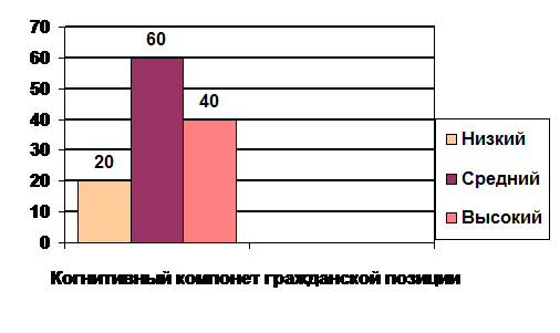 Диагностика показала исходный уровень сформированности когнитивного компонента гражданской позиции старшеклассников. У большинства учащихся выявился средний уровень (60%) политико-правовых и теоретико-гражданских знаний. Данная группа учащихся осознает себя гражданином своей страны, знает свои права и обязанности, но не всегда умеет реализовывать их в жизни без помощи взрослых. Высокий уровень (40% старшеклассников) показали глубокие знания по данным вопросам, хорошо ориентируются в терминах, владеют фактами, четко знают свои права и обязанности как гражданина, умеют точно отвечать на поставленные вопросы. И также определился низкий уровень (20%) - учащиеся практически не ориентируются в политико-правовых понятиях и правах граждан, плохо владеют специальной терминологией. Не умеют оперировать фактами и сведениями из истории страны и родного края.