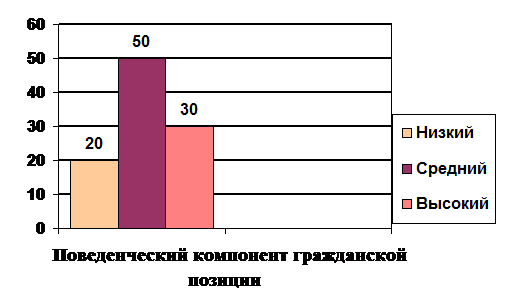 Низкий уровень сформированности эмоционально-ценностного компонента гражданской позиции зафиксирован у 20 % учащихся. Они не имеют представления об иерархии общечеловеческих ценностей, отсутствует потребность в проявлении гражданской позиции, не выполняют порученное дело или не доводят до конца.