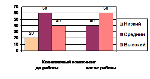 . Для определения когнитивного уровня гражданской позиции мы провели опрос старшеклассников. Диагностика показала уровень сформированности когнитивного компонента гражданской позиции после проведенной работы со старшеклассниками. После проведенного повторного анкетирования у большинства старшеклассников выявился высокий (60 %) и средний (40 %) когнитивный уровень гражданской позиции. Низкий уровень у учащихся не зафиксирован. Диагностика уровня когнитивного компонента гражданской позиции старшеклассников на контрольном этапе представлена на диаграмме 5.