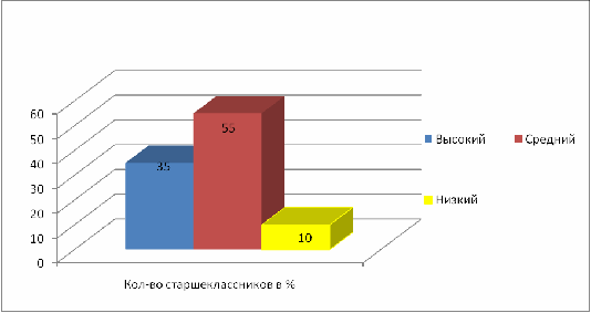 Итак, анализируя таблицу 6, можно сделать следующие выводы, по экономическому мышлению, высокий уровень наблюдался у 35% старшеклассников, средний уровень наблюдался у 55% старшеклассников, низкий уровень у 10% старшеклассников.