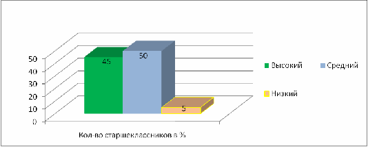 Итак, анализируя таблицу 8, можно сделать следующие выводы, по предпринимательским способностям, высокий уровень наблюдался 45% старшеклассников, средний уровень наблюдался у 50% старшеклассников, низкий уровень у 5% старшеклассников.