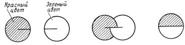 При быстром вращении дисков вокруг их центров с помощью небольшого электрического двигателя мы не различаем раздельно составляющих этот кружок цветных секторов. Цветные секторы быстро следуют один за другим, и создают в глазу ощущение одного смешанного цвета. Изменяя соотношение разноцветных секторов, можно получить всевозможные смеси, промежуточные между взятыми цветами.