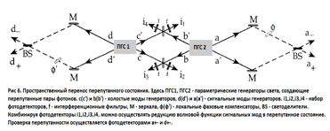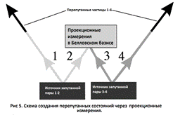 Проекционные измерения являются важнейшим методом перепутывания квантовых состояний для частиц, не рожденных совместно (Рис 5). Эту процедуру, называемую еще переносом квантовых корреляций между состояниями, мы рассмотрим в следующем разделе, посвященном обзору новейших экспериментальных разработок области физики перепутанных состояний.