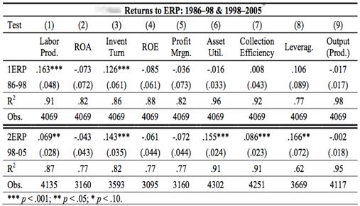 Таблица 3. Эффективность внедрения ERPв компаниях с 1986-1998 и 1998-2005 гг.