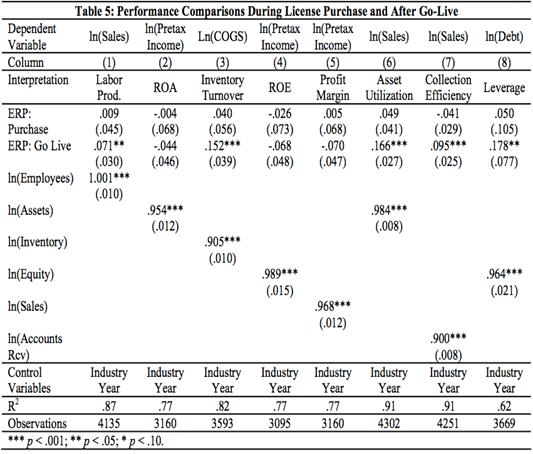 1. Ариал, Бринйолфcсон и Ву сравнили результаты исследований эффективности внедрения ERP в нескольких компаниях за 1986-1998 и за 1998-2005 гг. и обнаружили улучшение в показателях эффективности и производительности труда, однако финансовые показатели не сильно улучшились. Это показано в таблице 3.