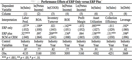 . Отдачу непосредственно от CRM и SCM довольно сложно оценить, потому что, как правило, их внедряют после или одновременно с ERP. Эффект от использования ERP может быть ошибочно рассмотрен как эффект от SCM/CRM и наоборот. Согласно полученным результатам, когда имеет место внедрение всех трех систем, эффект от использования ERP снижается, по некоторым параметрам ERP вообще не приносит никакой отдачи. А на отдельные показатели, такие как, например, производительность, коэффициент рентабельности собственного капитала(ROE), размер прибыли ERP оказывает негативное влияние.