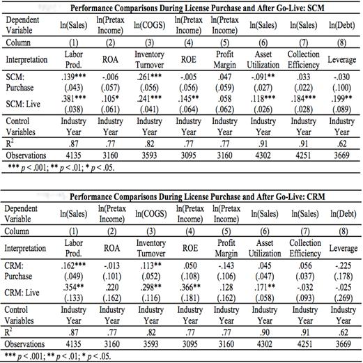 Причиной может быть отложенный эффект от запуска ERP. Как говорилось выше, обычно существует временной лаг между внедрением ИС и появлением первых результатов работы. Отложенный эффект ERP может ошибочно интерпретироваться как эффект от SCM и CRM. Однако, как показали дальнейшие исследования, задержка в появлении результатов работы ERP не является причиной эффекта SCM и CRM. Влияние SCM и СRM на показатели превосходит отложенный эффект.