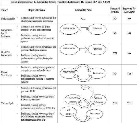 Возникает вопрос, действительно ли информационные системы повышают производительность и ведут к успеху компании, или же это успешные компании склонны к внедрению информационных систем? Действительно, если фирма получает высокие прибыли, почему бы ей не инвестировать деньги в IT? Возможно, компания хочет расширить производство, и для лучшей координации бизнес-процессов решает установить информационную систему. Или успешная корпорация видит в ИС инструмент для создания технологических барьеров входа в отрасль. Может быть, все дело в самих компаниях, их особенностях, а не в информационных системах? На этот вопрос ответили Sinan Arial, Erik Brynjolfsson, D.J.Wu встатье ”Which Came First, IT or Productivity? The Virtuous Cycle of Investment and Use in Enterprise Systems”.Используя данные 623 крупных американских компаний за 1988-2005 годы, онипроанализировалиэффективностьтрехнаиболеераспространенныхинформационныхсистем:Enterprise Resource Planning (ERP),Supply Chain Management (SCM), Customer Relationship Management (CRM).