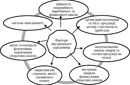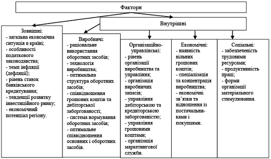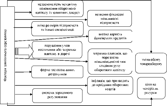 Учені наголошують, що важливу роль серед зовнішніх чинників відіграє взаємодія з постачальниками, споживачами, оскільки саме вони впливають на обсяг реалізованої продукції, залишки сировини на складах, величину дебіторської заборгованості. Крім того, підвищується якість продукції, покращується процес виробництва, залучається нове обладнання та зарубіжний досвід. Серед факторів внутрішнього середовища вагому роль відіграє стан основних фондів. Погіршення основних фондів призводить до підвищення витрат на обслуговування устаткування та ремонт, саме тому частина витрат переноситься на витрати майбутніх періодів, оскільки це впливає на величину оборотних засобів підприємства. Дещо схожої точки зору дотримувався Н. І. Гордієнко, який також виокремив фактори зовнішнього та внутрішнього середовища, зображені на рис. 4.