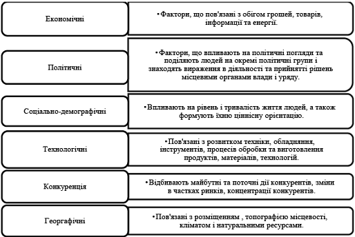 Також поширеною є класифікація факторів зовнішнього середовища за групами, зображеними на рис. 5.