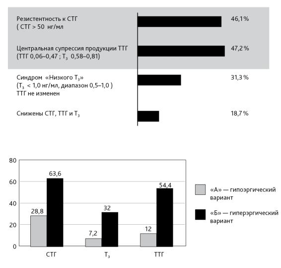Повышенную продукцию Т3 (15,4 % детей) мы наблюдали только при гиперэргическом варианте «Б». В этой же группе характерной чертой гормонального профиля был высокий базальный уровень СТГ.