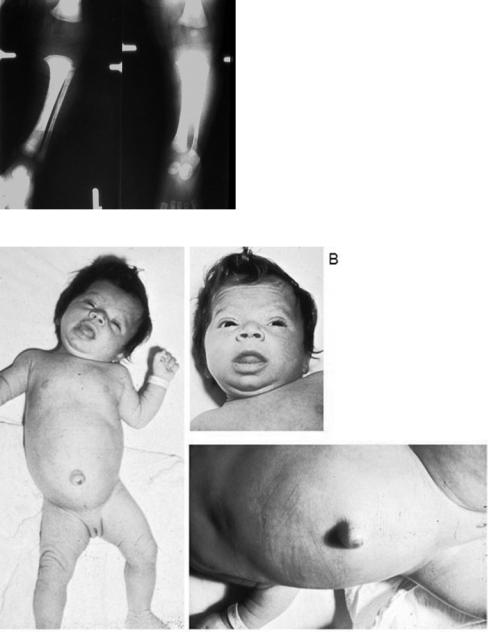 3-месячный ребенок с корригированным врожденным гипотиреозом; А — гипотония, макроглоссия, пупочная грыжа; В — специфический вид лица, макроглоссия, кожные пятна; С — вздутие живота, пупочная грыжа