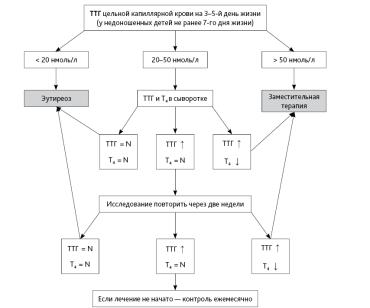 а. При ТТГ 10–20 мЕд/л и Т4 < 120 нмоль/л — срочно назначаются тиреоидные препараты. б. При ТТГ 20–50 мЕд/л и Т4 > 120 нмоль/л — лечение не назначается, повторное исследование ТТГ и Т4 — через 7 и 30 дней. В случае нарастания уровня ТТГ — назначается заместительная терапия.