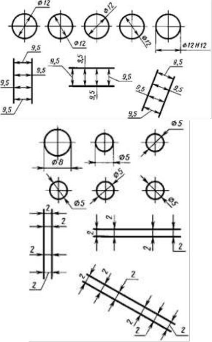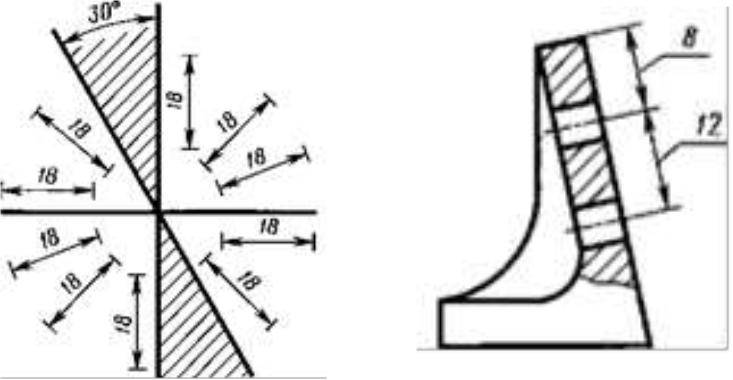 •При недостатке места для стрелок на размерных линиях, расположенных цепочкой, стрелки допускается заменять засечками, наносимыми под углом 45 ° к размерным линиям или четко наносимыми точками.