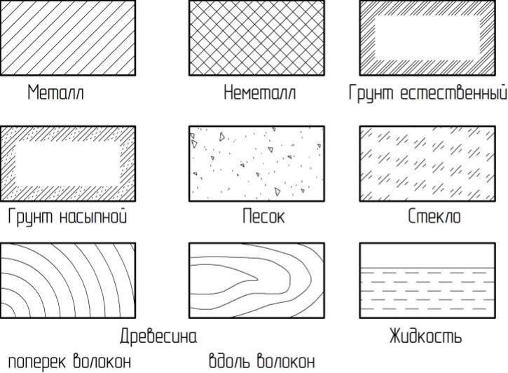 Для графического условного обозначения материала изделия в сечении выполняется штриховка, тип которой устанавливает ГОСТ 2.306-68 ЕСКД