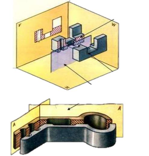 •На разрезе показывают то, что находится в секущей плоскости (фигура сечения), и то, что расположено за секущей плоскостью.