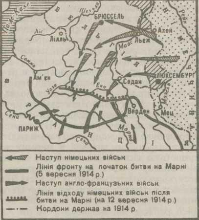 21 серпня німці вийшли на франко-бельгійський кордон й розпочали стрімкий наступ на Париж. На кінець серпня їхні війська опинилися в 25 милях від столиці Франції. Президент і уряд 2 вересня покинули Париж і вирушили до Бордо. Німецькі війська вийшли на річку Марна з метою оточити французів. Тут і відбулася перша битва на Західному театрі воєнних дій, що тривала з 5 по 12 вересня. В ній з обох боків взяло участь 1,5 млн. чоловік. Обопільні втрати складали 600 тис. убитими й пораненими.