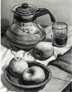 Вкачестве задания на экзамен дается выполнение рисунка натюрморта нескольких предметов разнохарактерной геометрической формы и фактуры, входящих в постановку.