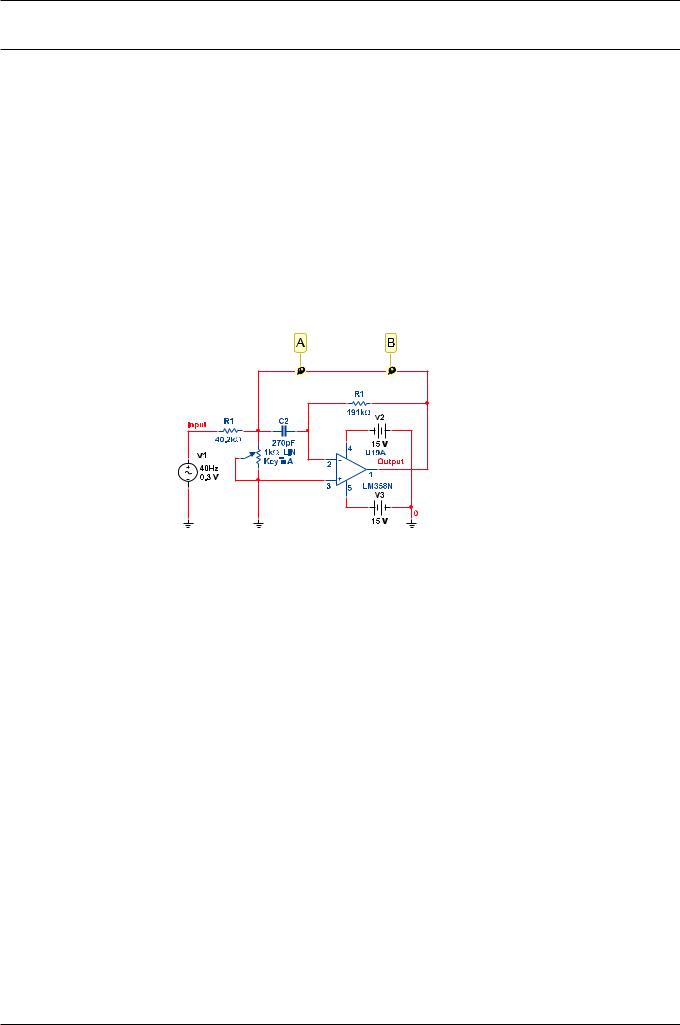 1)Создайте свою копию схемы 40kFILTER1_Complete.ms9, как показано на рисунке ниже. Выберите необходимые компоненты из Основной базы данных (Master Database) (Разместит ь/Компонент Place/Component) и Популярного списка (In-Use List). Установите значения компонентов, как показано на рисунке. На заметку: компоненты R1, R2 и C2 виртуальные.