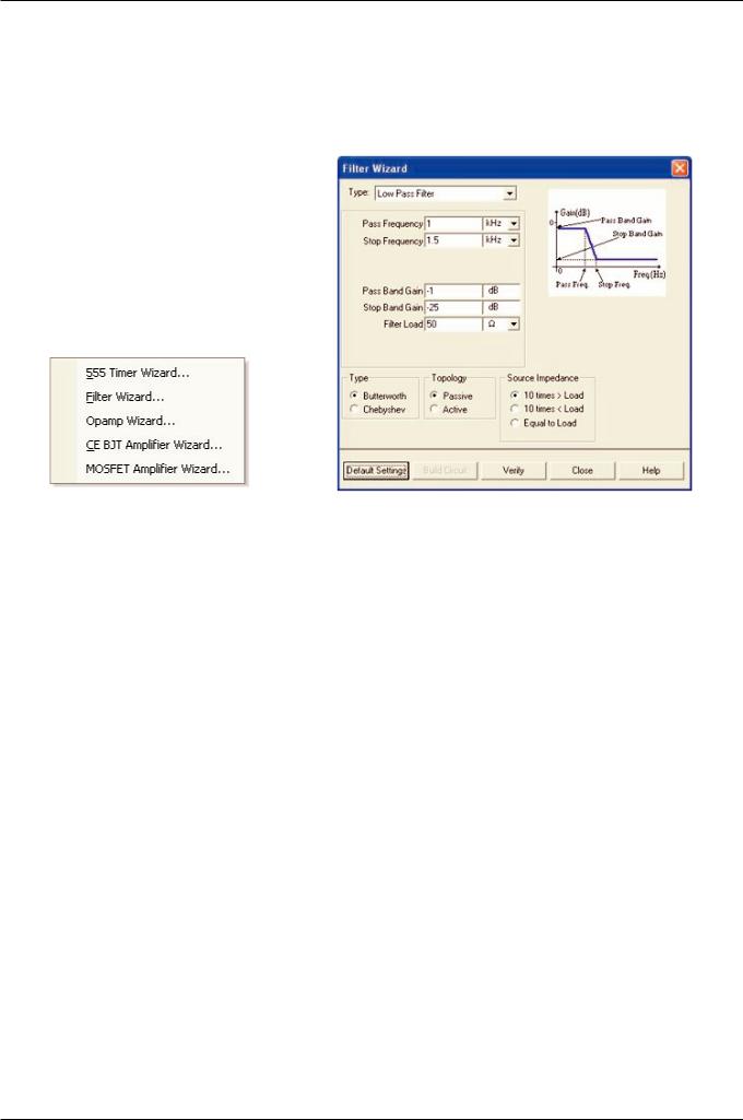 Мастер усилителей с общим эмиттером на биполярном плоскостном тр анзисторе (Common Emitter BJT Amplifier Wizard) помогает создать усилитель с общим эмиттером с заданными параметрами. MOSFET (ка нальный полевой униполярный МОП-транзистор) усилители создаются с помощью соответствующего мастера (MOSFET Amplifier Wizard). В Multisim есть несколько схем с операционным усилителем. В полях Мастера ОУ Multisim (Opamp Wizard) нужно ввести требуемые параметры: