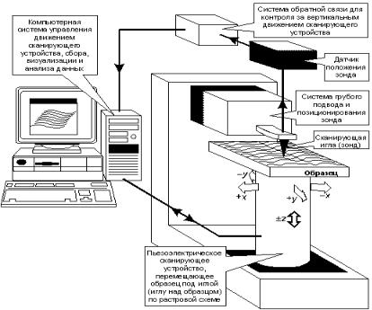 В конструкции каждого сканирующего зондового микроскопа есть свои отличия. Однако общая структура СЗМ остается более или менее одинаковой. В состав СЗМ-комплекса обычно входит компьютер, который управляет работой электромеханической части микроскопа, принимает и записывает регистрируемые зондом данные и производит на их основе построение СЗМ-изображения. Кроме того, специальное программное обеспечение позволяет исследователю как угодно манипулировать полученным изображением (масштабировать, поворачивать, строить сечения и т.п.) чтобы проанализировать наблюдаемую картину поверхности.