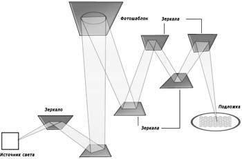 Набор зеркал между маской и подложкой с резистивным обеспечивает уменьшение размера изображения в 4 раза позволяет рисовать линии с разрешением до 70 нм.