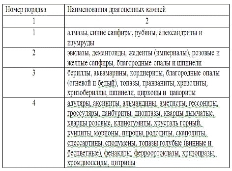 Понятие «драгоценные камни», существующее в таможенном законодательстве РФ, включает минералы природного происхождения - рубины, изумруды, сапфиры, алмазы, александриты, а также янтарные уникальные образования, превышающими вес в 1000 г, и жемчуг в первозданном и обработанном состоянии.