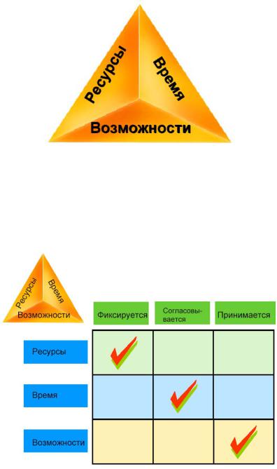 Управление компромиссами. Хорошо известна взаимозависимость между ресурсами проекта (людскими и финансовыми), его календарным графиком (временем) и реализуемыми возможностями (рамками). Эти три переменные образуют треугольник, показанный на рис. 8.5.