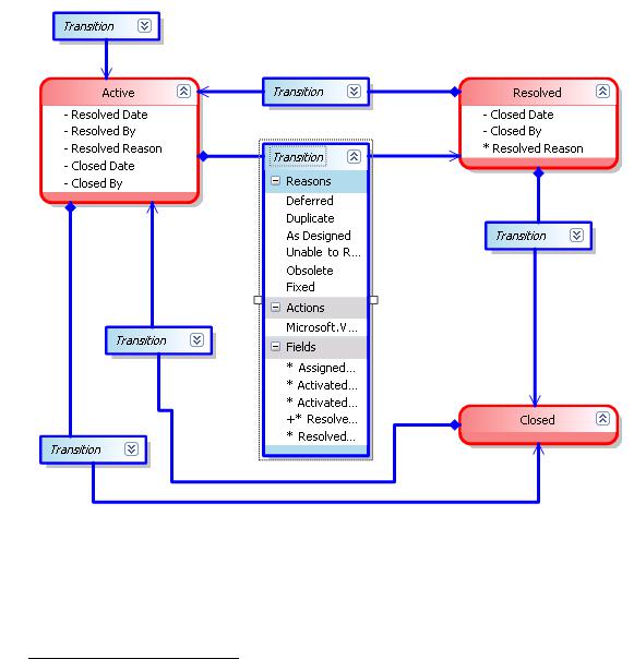 Кроме того, каждый тип элемента работы имеет описание переходов между своими состояниями состояний, причины, вызывающие эти переходы и действия, выполняемые в них. Причинами могут являться, например, «выполнен», «устарел», «отложен» и т.д. Переходы может осуществлять сама система TFS, автоматически, но в большинстве