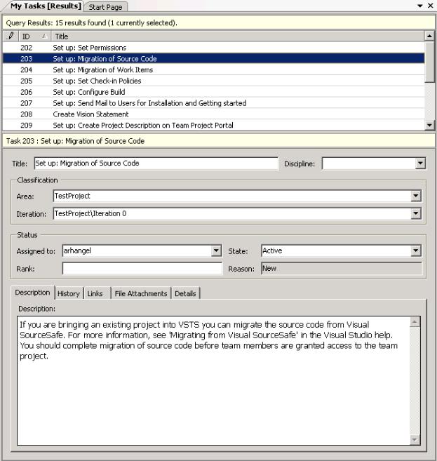 Итак, когда разработчику понадобилось получить доступ к определенной группе элементов работ (например, к ошибкам, которые ему нужно исправить), он выбирает соответствующий запрос и выполняет его. В результате в специальном окне будет открыт список элементов работы, удовлетворяющих данному запросу (рис.12.8), а при выборе определенного элемента, в нижней части окна-списка отобразится детальная информация об этом элементе (а при двойном щелчке элемент работы будет открыт в отдельном окне).