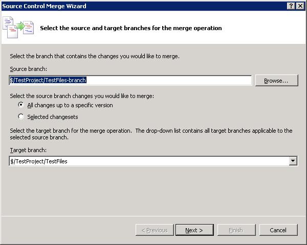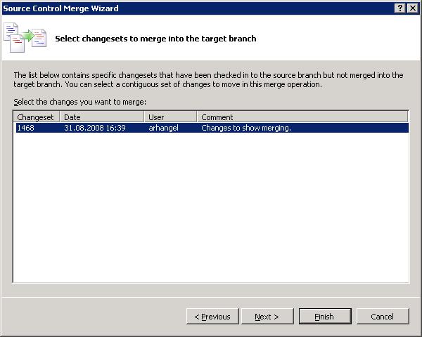 На первом шаге (рис. 13.10) разработчик задает откуда (source branch) и куда (target branch), а также изменения из какой области он хочет перенести (все вплоть до определенной версии, или только выбранные пакеты изменений).