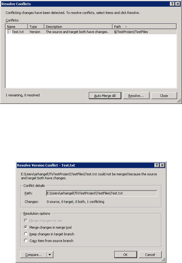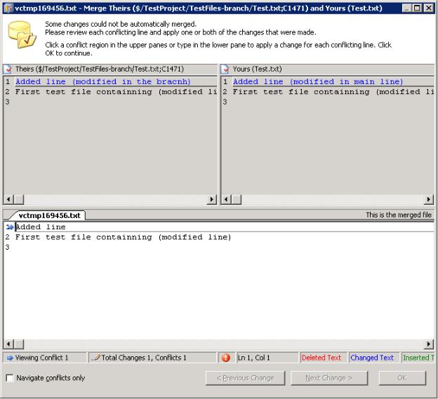 Разработчик может выбрать автоматический способ разрешения, который сработает только для тех файлов, в которых были изменены разные части. В случае, если автоматическое разрешение невозможно, система откроет диалог ручного разрешения – см. рис. 13.14.
