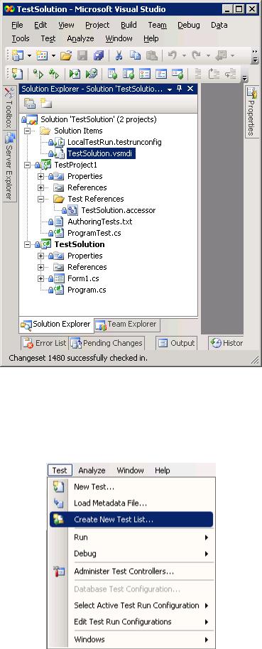 Как правило, модульные тесты и тестовые конфигурации разрабатываются самими разработчиками, основная задача тестера в этом случае – организовать все тесты в упорядоченную структуру пакетов и указать, какие пакеты должны исполняться в каких условиях. Вся иерархия тестов хранится в так называемом файле метаданных, имеющем расширение vsmdi. Этот файл находится в системе контроля версий и может быть включен в решение как отдельный элемент – см. рис. 14.7.