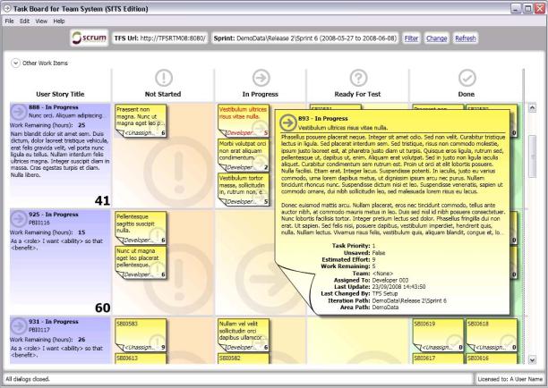 Отдельного упоминания заслуживает система Task Board for Team System, которая позволяет визуализировать представления основного средства управления и мониторинга в Scrum – доски с задачами. Эта система получает информацию о всех элементах Sprint Backlog с сервера и визуализирует их в виде стикеров на доске, позволяя изменять их состояния путем перетаскивания, смю рис. 15.3. Этот продукт можно бесплатно скачать по ссылке http://www.scrumforteamsystem.com/en/TaskBoard/default.aspx.