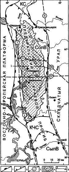 положение Соликамской впадины [1]: 1 - границы Предуральского краевого -