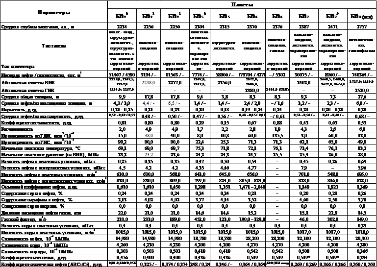 Пласт в пределах залежи по мощности не выдержан и меняется в диапазоне 0,8-50 м при среднем значении 28 м. Эффективная нефтенасыщенная толщина находится в пределах 0,8-28,7 м среднее значение - 7,2 м. Среднее значение газонасыщенной толщины составляет 0,5 и меняется в пределах 0,8-3,8 м. Параметры геологической неоднородности: песчанистость - 0,53, расчлененность - 6. (таблица 2.3.1)