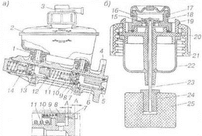 Главный тормозной цилиндр автомобиля ВАЗ-2109 (рис. 146, а) в сборс с бачком 2 крепится гайками к шпилькам вакуумного усилителя. В корпусе 4 имеются два поршня, управляющие каждый своим контуром.