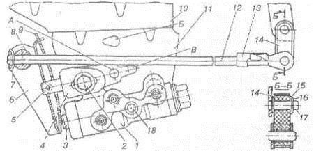 К кронштейну 4 приварен палец, являющийся упором рычага 6. Двуплечий рычаг 6 поворачивается на штифте 5, запрессованном в отверстие упора. В верхнем отверстии рычага 6 имеется ось 8, через отверстие которой проходит конец упругого рычага 12 привода регулятора. Ось 8 рычага и рычаг 12 стопорятся фиксатором 7. Для исключения влияния вибраций и колебаний от деталей привода на поршень 3 регулятора давления на упоре рычага 6 установлена пластинчатая пружина 9. Ее верхняя часть заходит в щель рычага 6, а нижняя упирается в нижнее плечо рычага. Упругий рычаг 12 свободно проходит через овальное отверстие пружины 9. Другой конец упорного рычага 12 шарнирно соединяется с серьгой 14, которая качается на пальце 17 кронштейна рычага задней подвески. Серьга удерживается на пальце стопорной шайбой 15 с кольцом 16, а на конце упругого рычага - скобой 13.