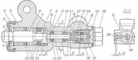 поршня; 24 - заглушка; А, Д - камеры, соединенные с главным цилиндром; Б, В -