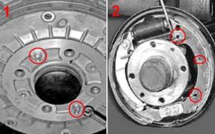 Дальше поддомкрачиваем и снимаем колесо, после чего надо снять тормозной барабан, который держится на двух направляющих болтах, их надо будет отвернуть фото 1.