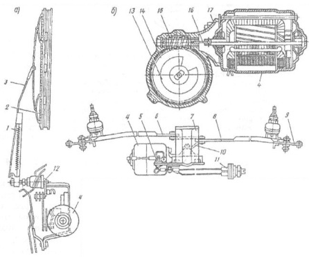 Кривошипный механизм преобразует вращательное движение червячной пары редуктора в качательное движение рычагов и щеток. Кривошип 10, установленный на валу шестерни 14 редуктора, при вращении через промежуточные тяги 6 и 8 поворачивает поводки 9 правой и левой щеток. К поводкам прикрепляются оси 12 рычагов 3 щеток. Металлокерамические втулки осей пропитываются маслом и при эксплуатации не смазываются. Рычаги щеток постоянно прижимаются к стеклу пружинами 1 с усилием примерно 7... 9 Н.