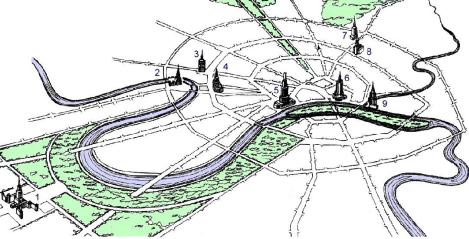 однофункциональные высотные сооружения (офисы, гостиницы) сочетались с жилыми домами (группами домов) средней и повышенной этажности и объединялись малоэтажными объектами инфраструктуры;