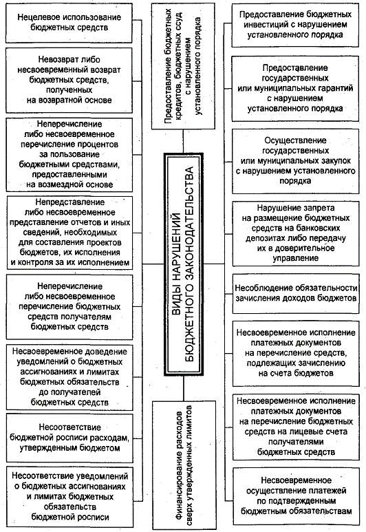Закон точно определяет виды нарушений бюджетного законодательства, за которые виновные должны быть привлечены к ответственности: преднамеренное сознательное неисполнение действующего законодательства; нецелевое расходование средств (направление средств на финансирование программ, которые не внесены в бюджет для инвестирования в рамках конкретного периода); отказ от перечисления или же неполное перечисление бюджетных ресурсов на реализацию проектов, предусмотренных законом о бюджете; задержки с подачей отчетов, а также иных документов и сведений, которые дают представление о ходе исполнения бюджета; нарушение порядка и правил ведения отчетно-учетной документации, несоответствие подписи и данных, содержащихся в данных документах.