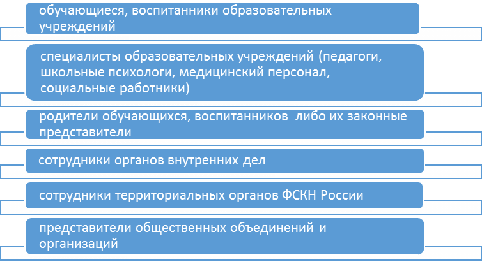 Для профилактики ПАВ должны быть привлечены и скоординированы все субъекты образовательной сферы, начиная системой здравоохранения, правопорядка, культуры, также совместно с социальной защитой населения, общественными объединениями и организациями и др.) [18].